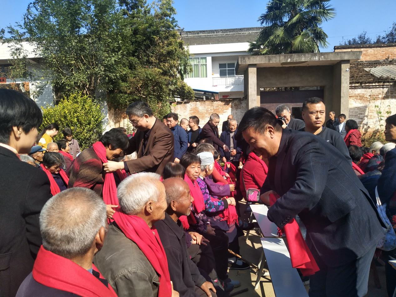 接下來(lái),市水務(wù)局副局長(zhǎng)劉博和公司董事長(zhǎng)王長(zhǎng)隨為村里的老人們佩戴紅圍巾。暖暖的紅圍巾,滿滿的民生情。戴著滿載孝意的紅圍巾,老人們臉上洋溢著笑容,倍感溫馨。